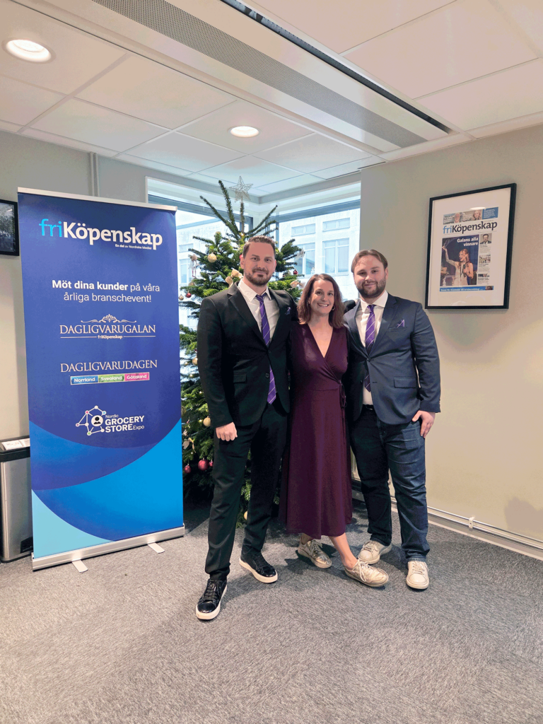 Tobias Estlind. Key Account Manager på Fri Köpenskap, Caroline Magnéli, Senior projektledare för Fri Köpenskaps event och Alfred Dahlgren Antelius, Account Manager på Fri Köpenskap